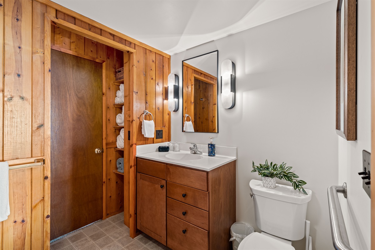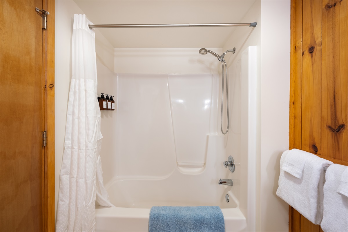 Two full bathrooms stocked with shampoo, conditioner, body wash, plush towels, and all essentials. Clean, bright, and ready for your stay. Smaller bathroom has a shower and the larger jack-n-jill bathroom has a full tub with shower.