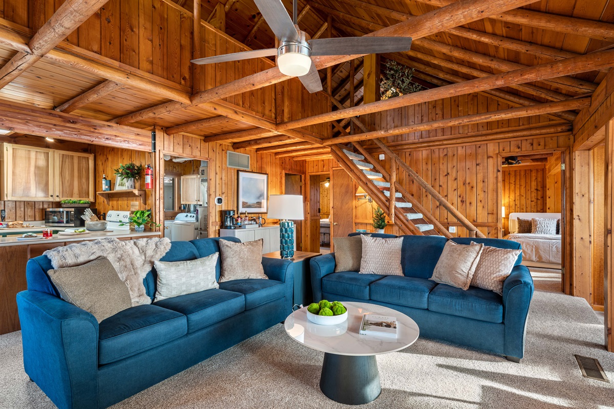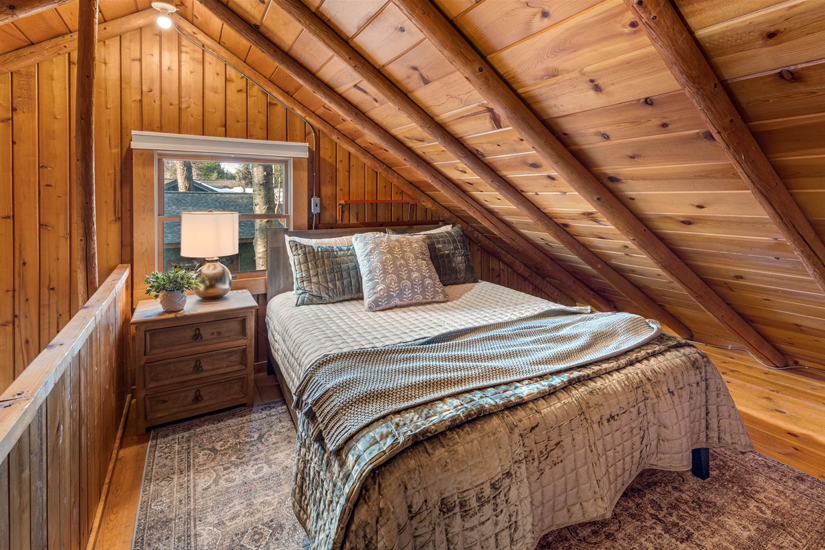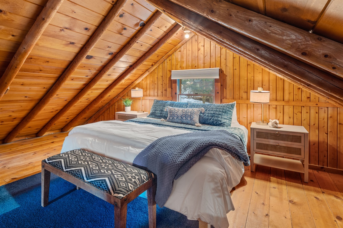 • Loft Bedroom has two separate areas with a total of 3 beds (Upper Level): Spacious and versatile — one end features a queen bed open to the living room below; the other offers privacy with a king bed and oversized chair with twin pull-out bed — ideal for kids or extra guests.