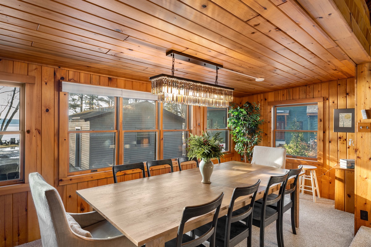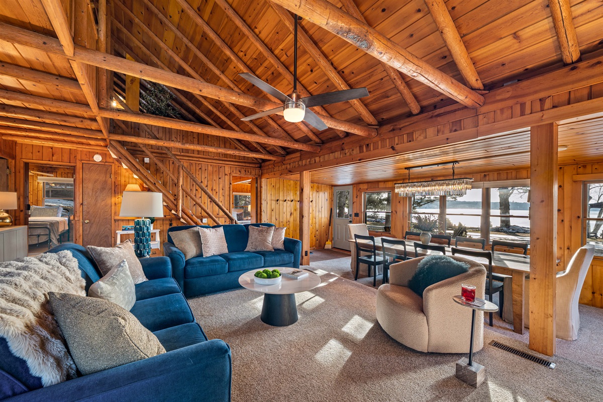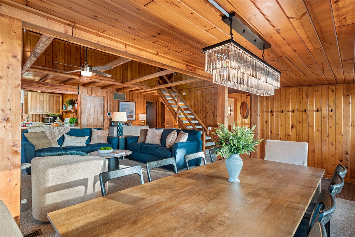 Gather around the dining table for 8, or relax in the open living area with lake views, a Smart TV, and cozy sofas perfect for movie nights or morning coffee.
